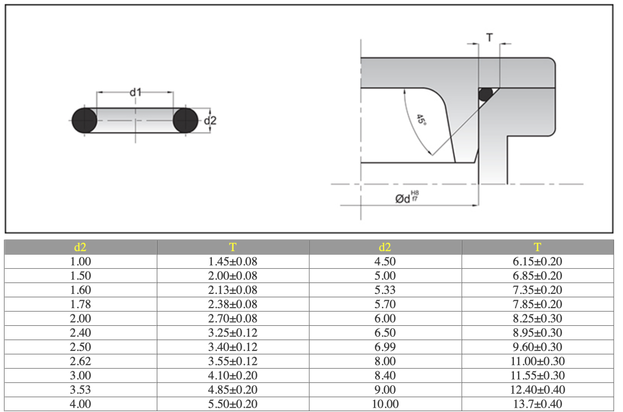 對于執(zhí)行GB34521-94標(biāo)準(zhǔn)的0形圈,因?yàn)槠錅喜蹣?biāo)準(zhǔn)GB3452.3-87中并未涉及三角形溝槽,可參考下表設(shè)計,也可按T=1.3~1.4W(W即0形圈斷面直徑)設(shè)計三角形溝槽。